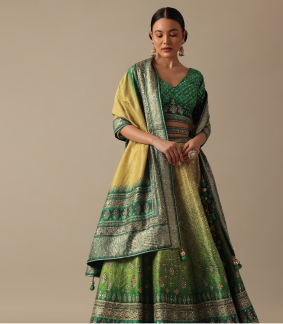 Green Silk Printed Lehenga Set